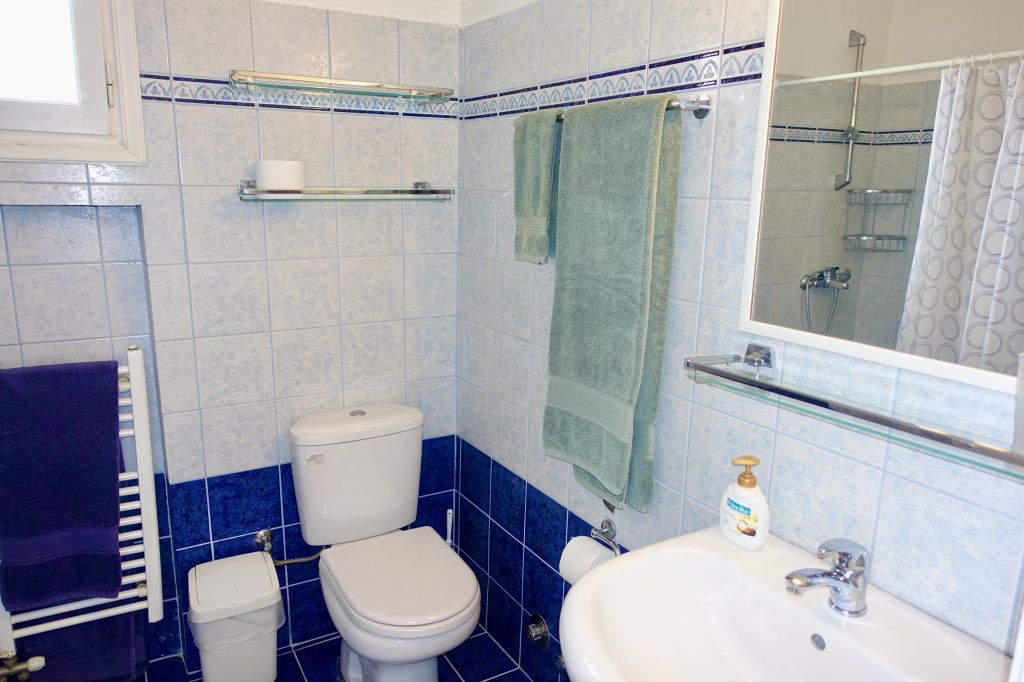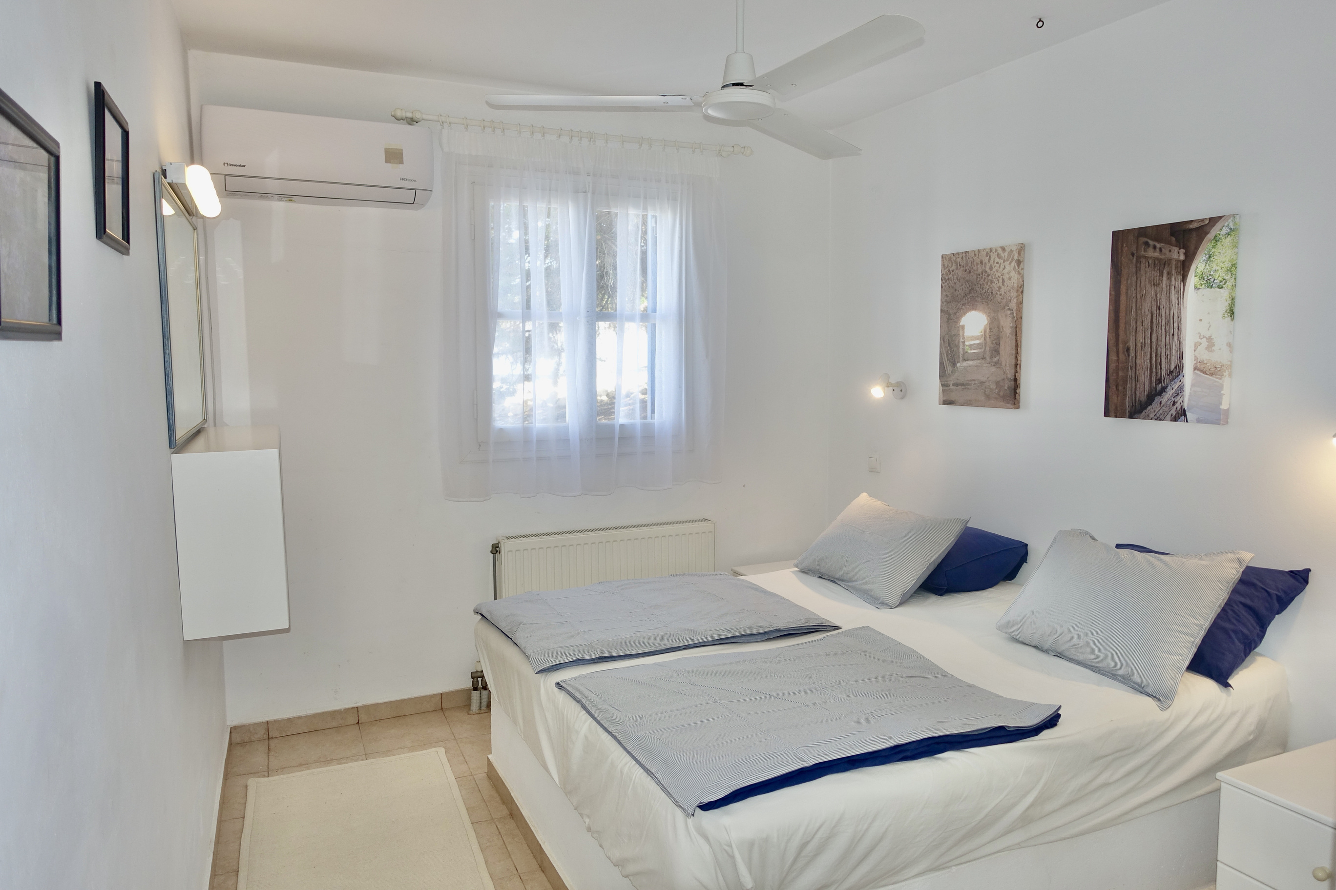 It has two bedrooms, one double (queen size bed) and one twin (2 single beds). The double bedroom has its own en-suite bathroom. There is a second bathroom with a shower. Both bedrooms have air conditioning and ceiling fans.