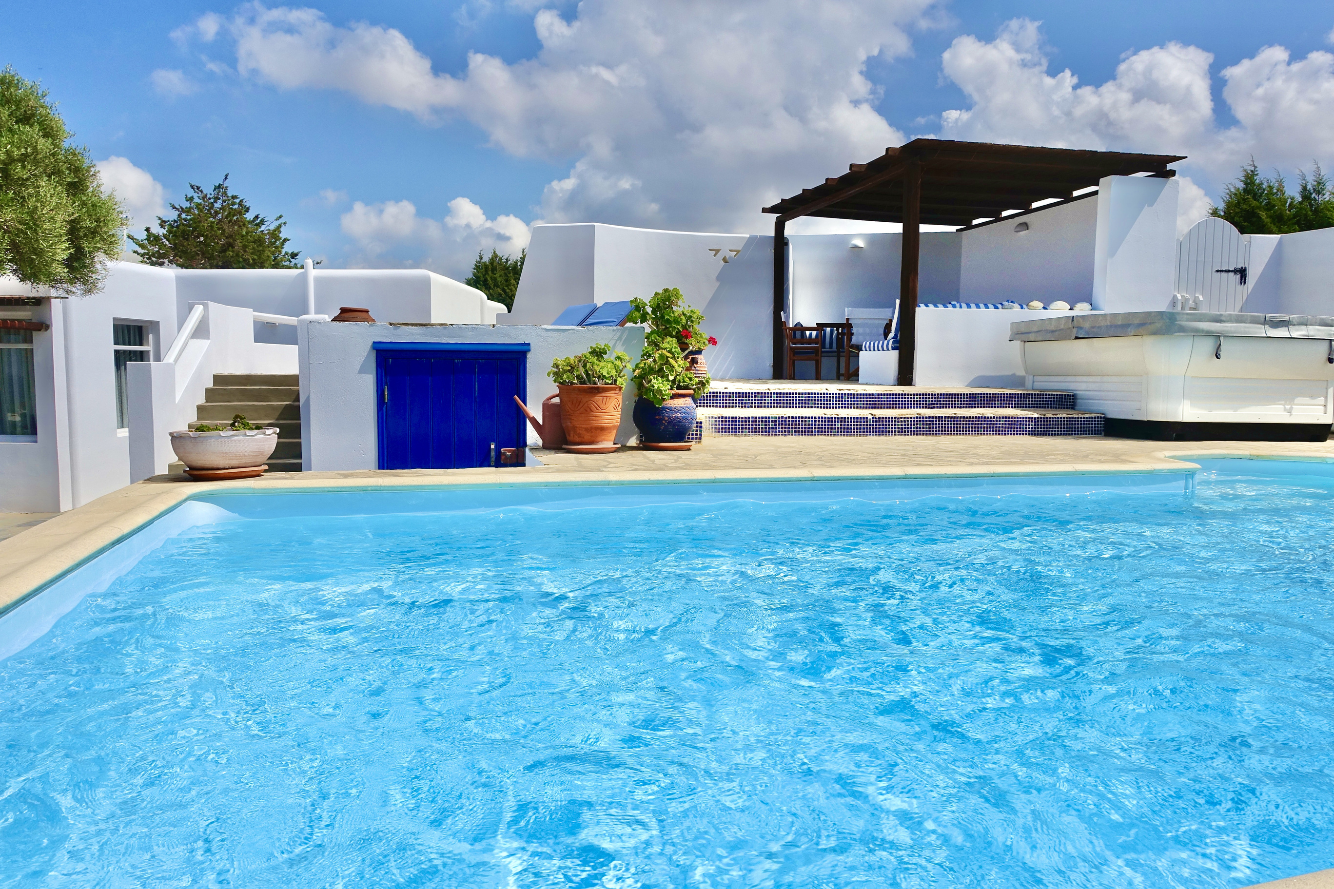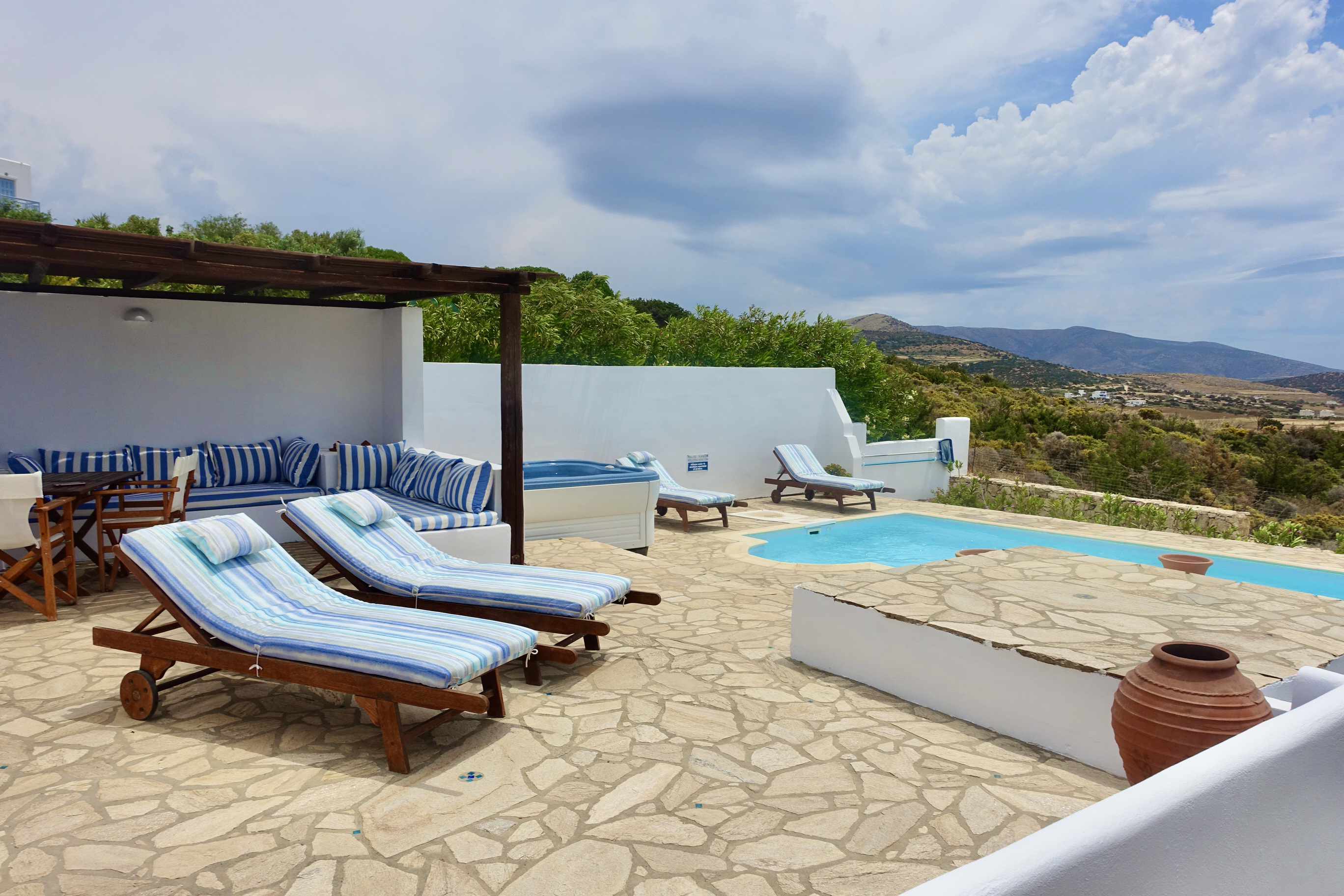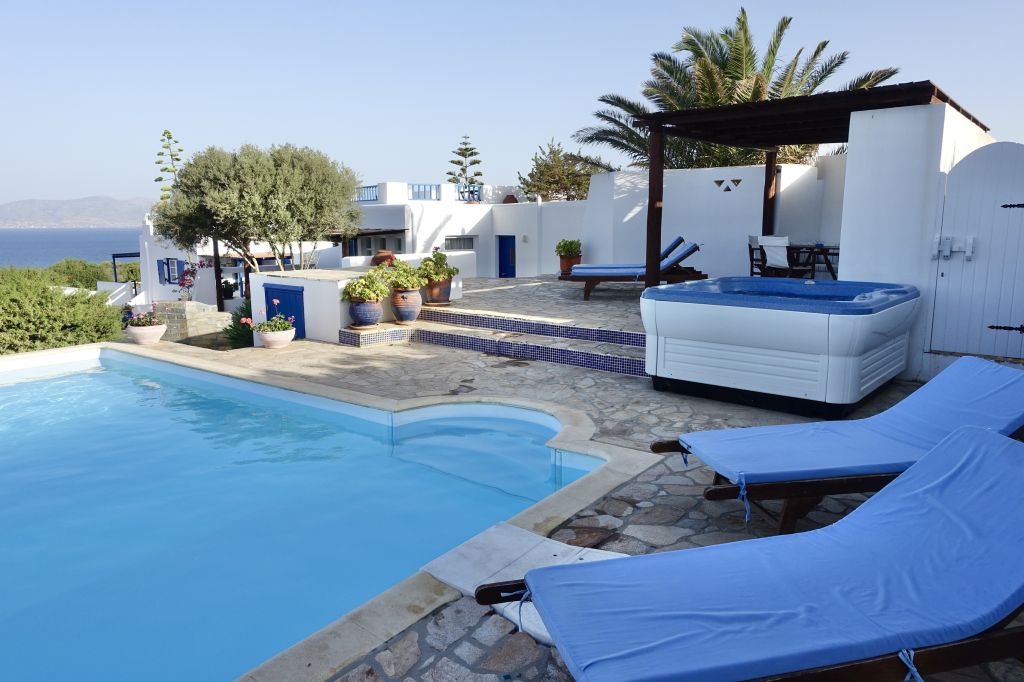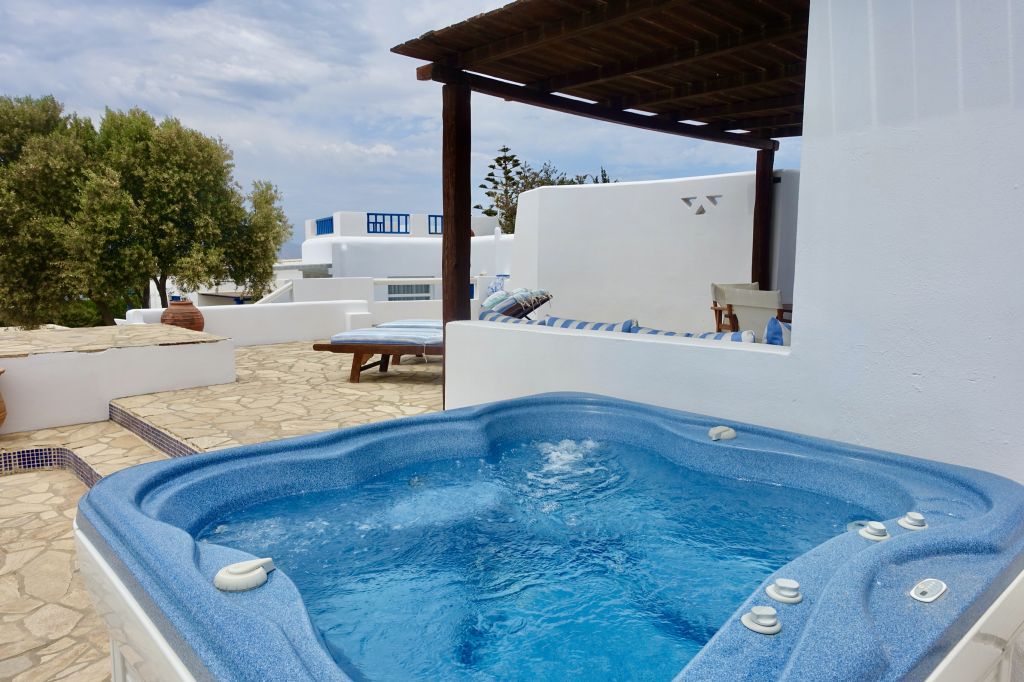 Relax in the open-plan living area and dine outdoors on the shaded veranda. Step just a few steps to your private pool and sun terrace, then unwind in your private spa/Jacuzzi with sea glimpses.